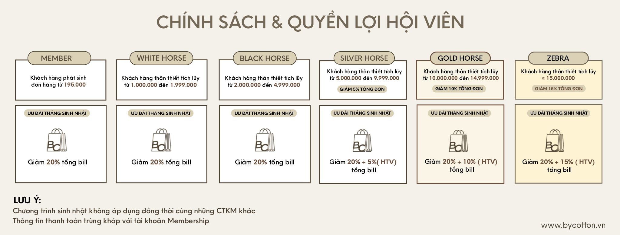 + Hạng thành viên Member - White Horse - Black Horse: Mặc định 20% tổng đơn
