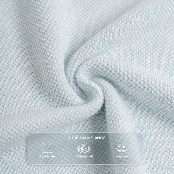 Chất liệu: Cotton Melange, sản phẩm được dệt từ 98% cotton với hiệu ứng Melange (đốm đặc trưng) – một kỹ thuật dệt tạo nên sự pha trộn tinh tế giữa hai tông màu, đem lại sắc thái pastel – trung tính.