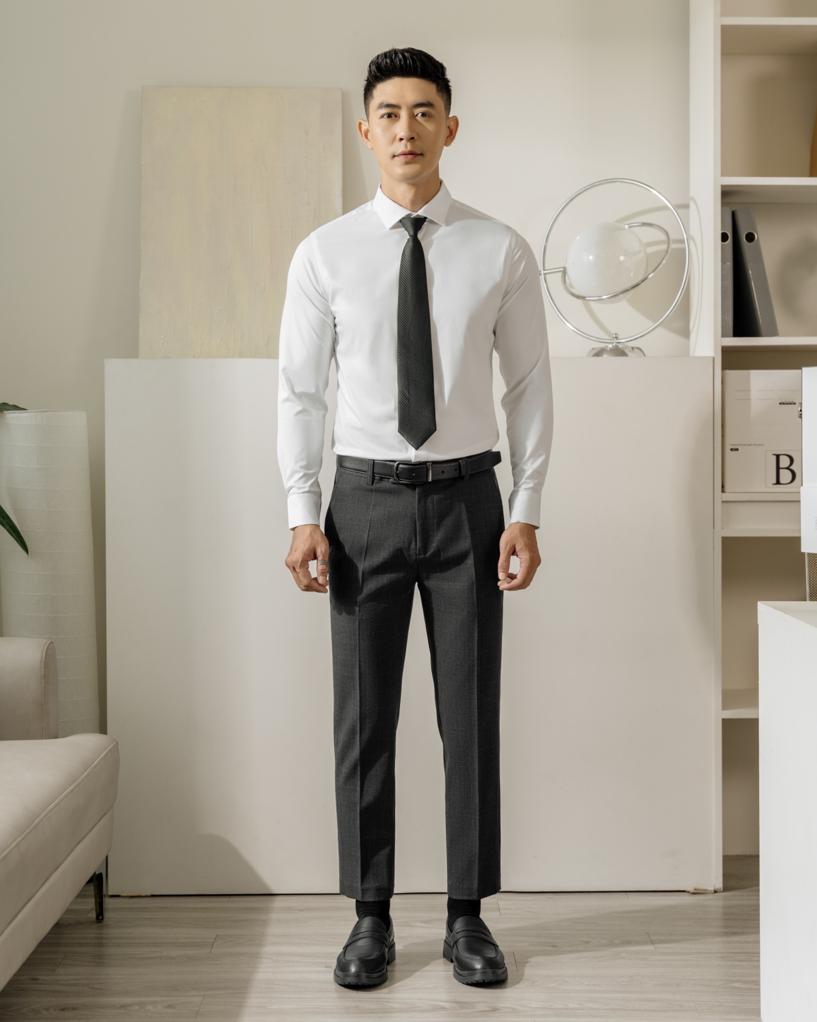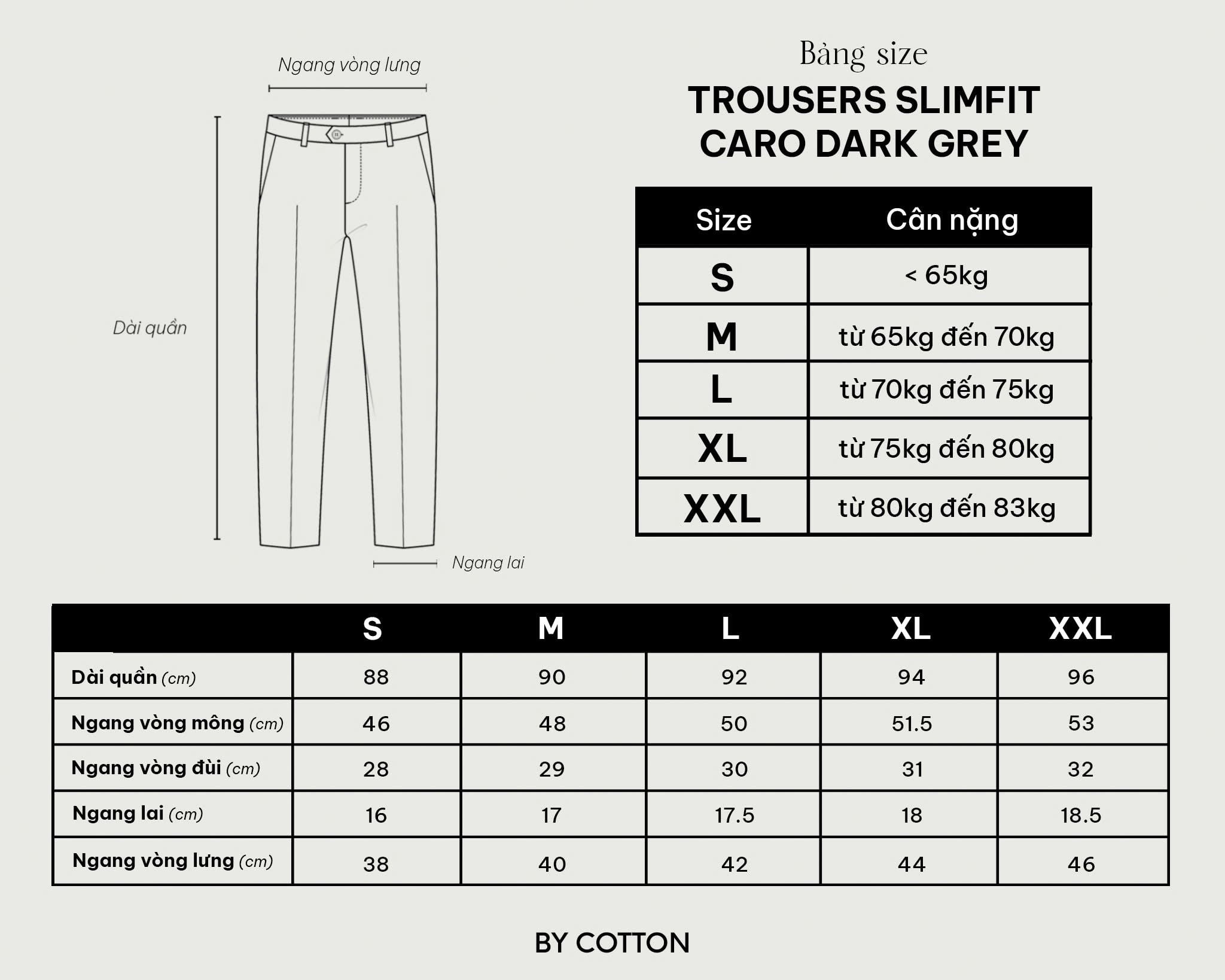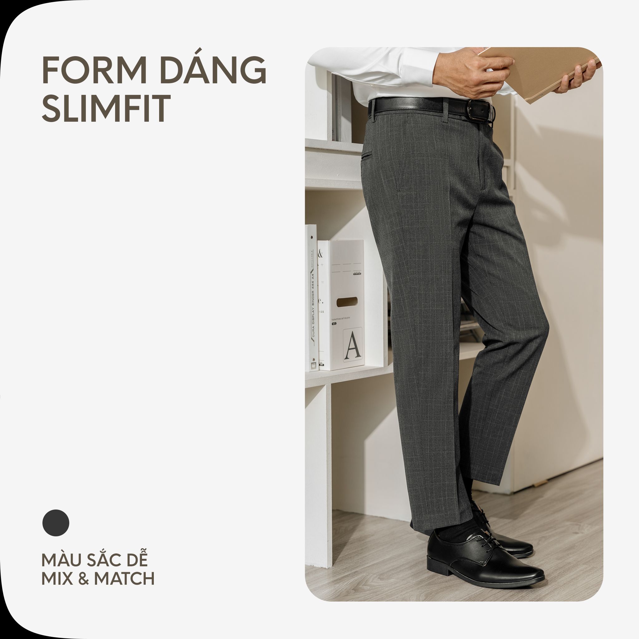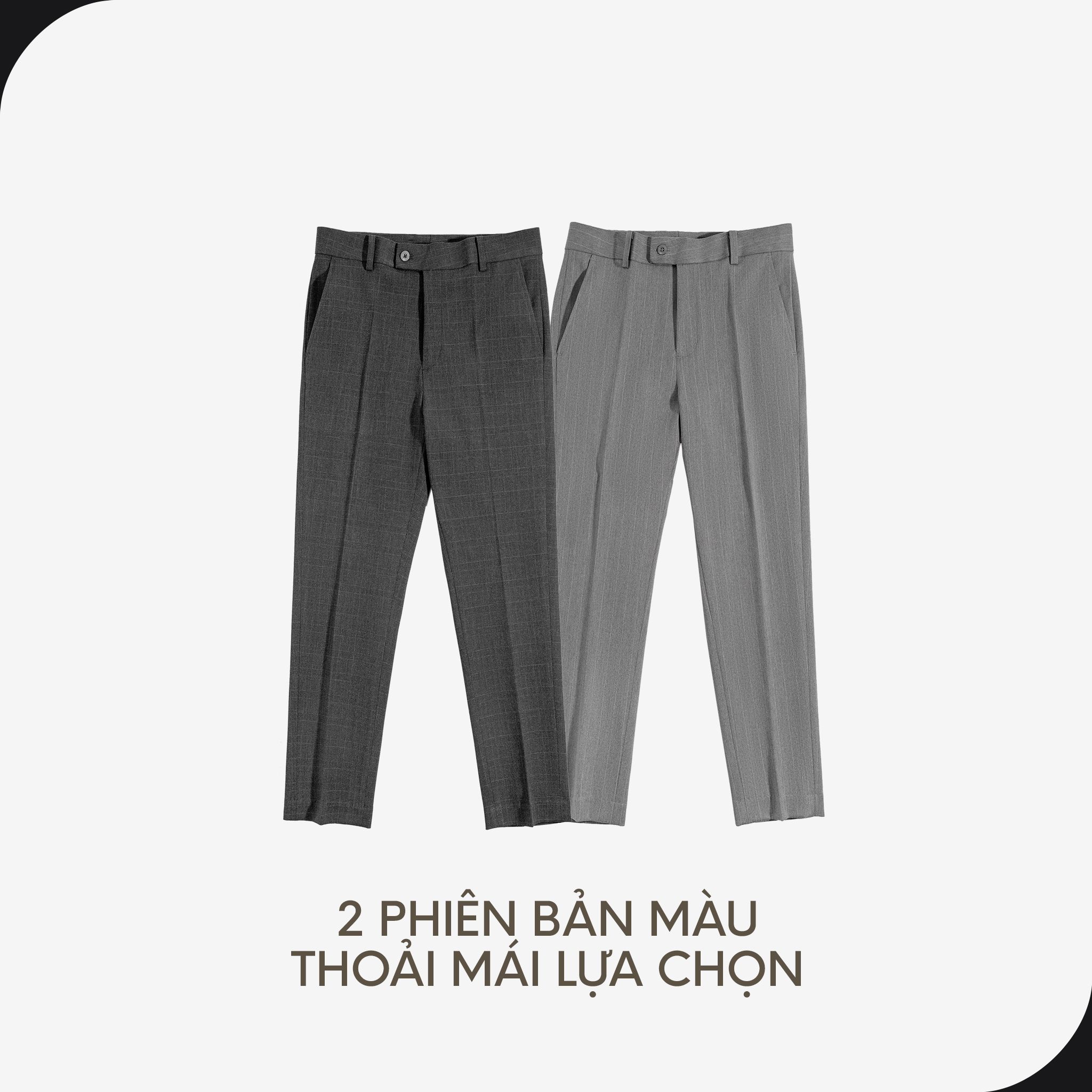 FORM DÁNG: Formal lịch lãm, Slimit vừa đủ không khiến phần hông hay ống đùi bị ôm. Dài quần đến mắt cá chân ở mức vừa phải (Form rất đứng). Phối kèm sơ mi hay các mẫu Polo đều hợp.