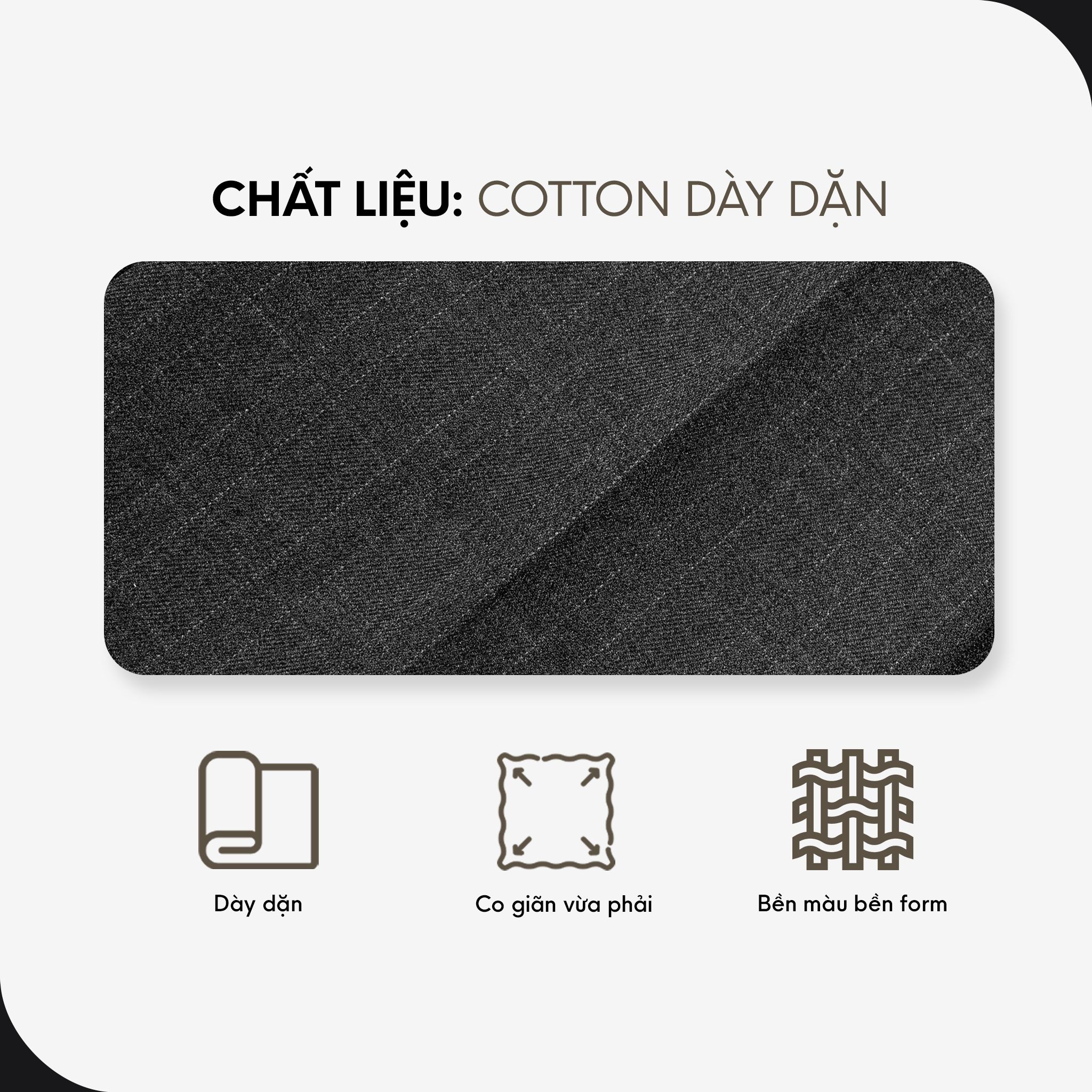ĐẶC ĐIỂM: Chất vải dày dặn, co giãn tốt, hạn chế nhăn. Zip kéo mượt mà, khuy quần bền cứng. Các chi tiết quần được hoàn thiện tỉ mỉ, Lưng quần phẳng - dày kết hợp đĩa quần được tinh chỉnh tỉ lệ kĩ càng. Phần ly ống được ủi form sẵn sẽ khiến tổng thể outfit thanh lịch hơn.